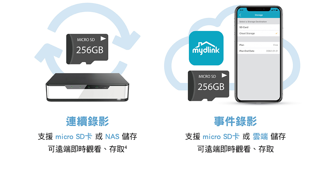 - 多元儲存:支援連續錄影可儲存至記憶卡,事件錄影至記憶卡/雲端