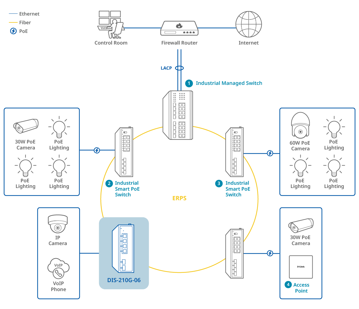 The DIS-210G-06 is an industrial smart switch equipped with four 1G ports and two 1G SFP ports for network management and aggregation. The SFP ports support long-distance data transmission, rapid failover redundancy, and throughput aggregation. The DIS-210G-06 supports ERPS and static routing, which reduces latency, enables effective traffic control, and improves network scalability and efficiency.
