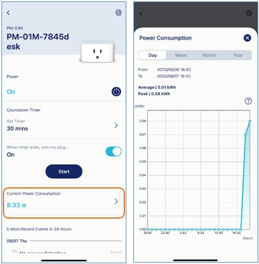 步驟 3: 您將可即時查看所連接裝置的耗電情況。如需查看詳細的歷史用電記錄,請點選「目前耗電量」,並選擇時間範圍(日、週、月或年)以檢視統計數據。