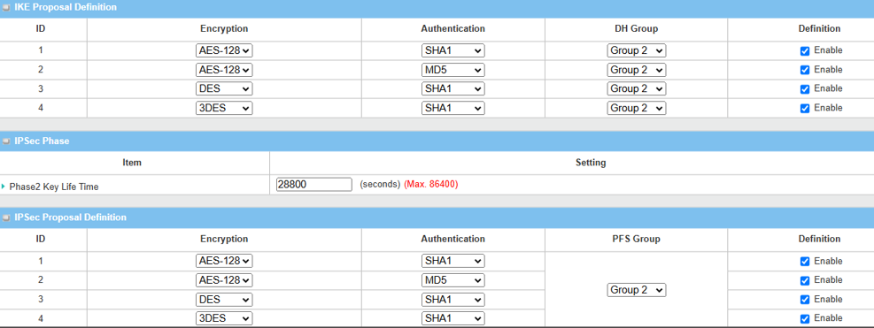 IPsec Proposal Definition Leave the Enable default setting on Web UI