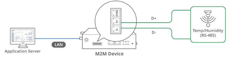 We use the DOM-530-TSO and “Modbus Poll” tool for example. The D-Link M2M DOM-530-TSO device on the left has a RS-485 interface that can connect D+ and D- to the IoT sensor.
