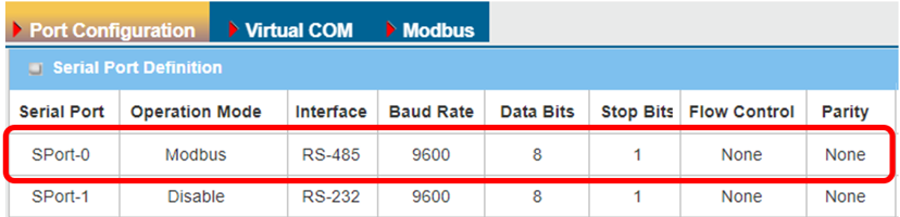 Serial Port Displays the SPort-0 of the RS-485 interface