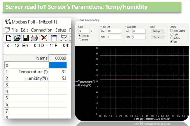 The application server collects temp/humidity data from the IoT sensor via Modbus RTU and Modbus TCP protocols. This is the test result of temperature and humidity data collected on Modbus Poll.