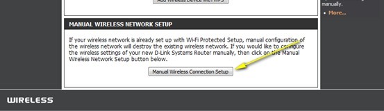 Step 3: Click on the Setup tab at the top and then click on Wireless Settings from the menu on the left-hand side. Then click Manual Wireless Connection Setup.