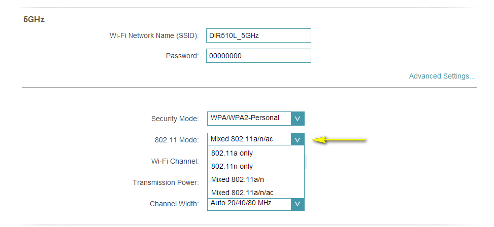 • Mixed 802.11a/n/ac (default) - Wireless devices compatible with 802.11ac, 802.1ng, and 802.1a can connect.