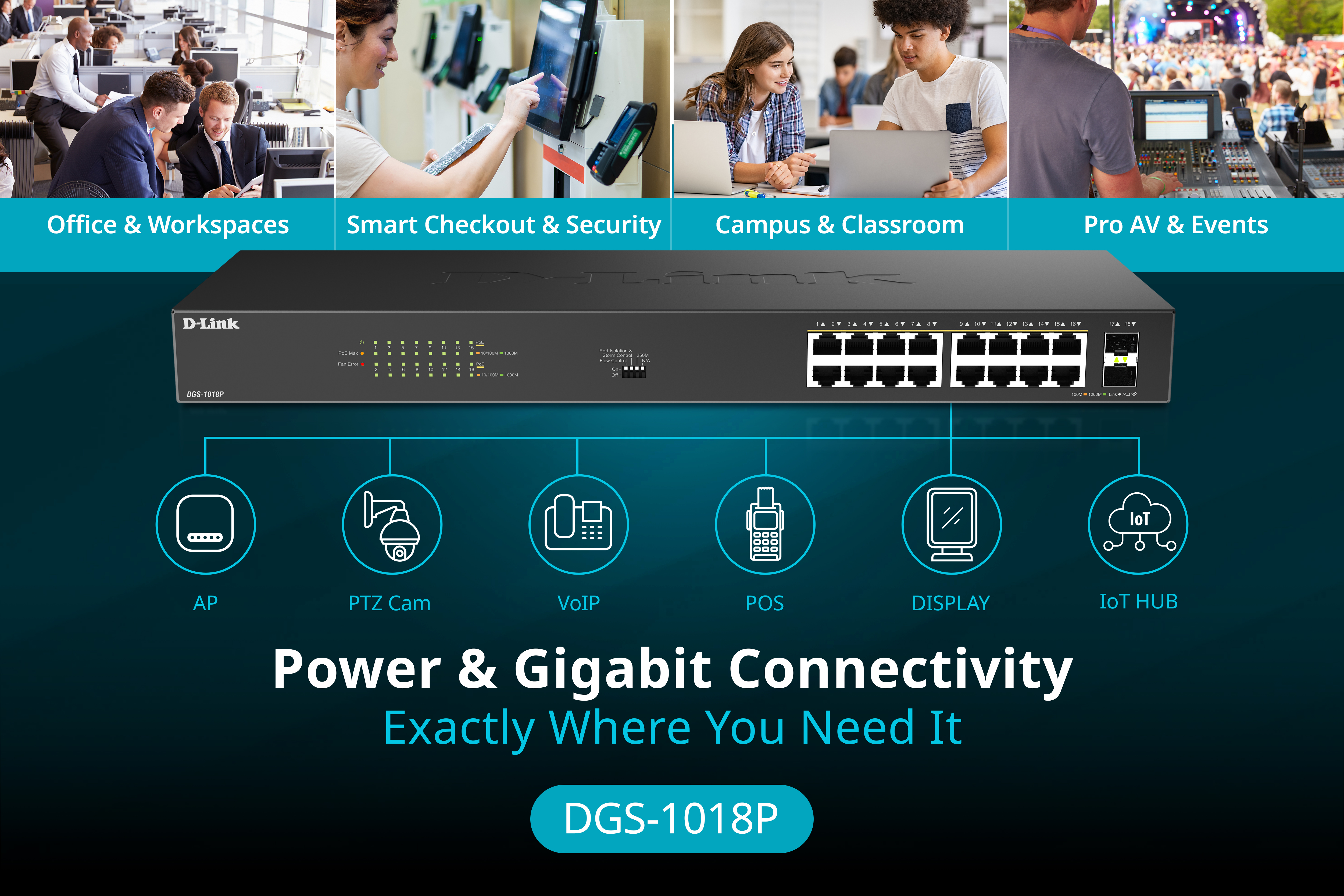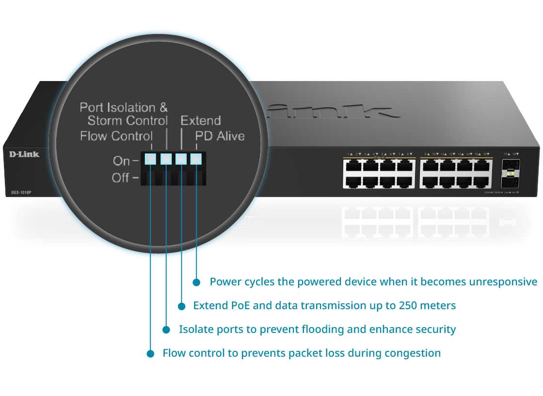 The D-Link DGS-1018P 16-Port Unmanaged PoE+ Switch with 2 SFP Ports gives you built-in physical controls to instantly adjust key settings without logging into a web interface. You can quickly enable features like long-range PoE for distances up to 250 meters, automatic reboot for unresponsive devices, port isolation for better security, and storm or flow control for improved stability.* It’s a fast, technician-free way to adapt your network right at the switch—ideal for dynamic environments where time and simplicity matter.