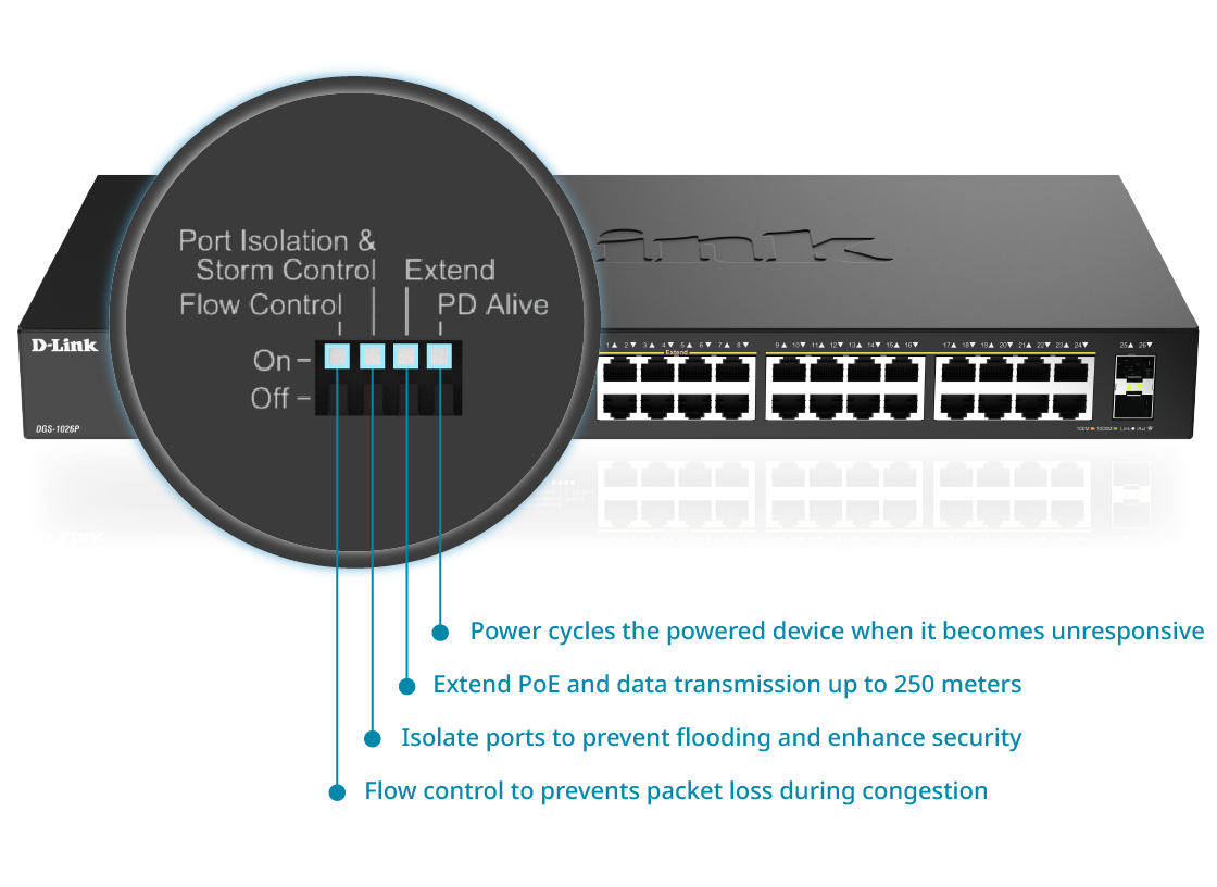 The D-Link DGS-1026P 24-Port Unmanaged PoE+ Switch with 2 SFP Ports gives you built-in physical controls to instantly adjust key settings without logging into a web interface. You can quickly enable features like long-range PoE for distances up to 250 meters, automatic reboot for unresponsive devices, port isolation for better security, and storm or flow control for improved stability.* It’s a fast, technician-free way to adapt your network right at the switch—ideal for dynamic environments where time and simplicity matter.