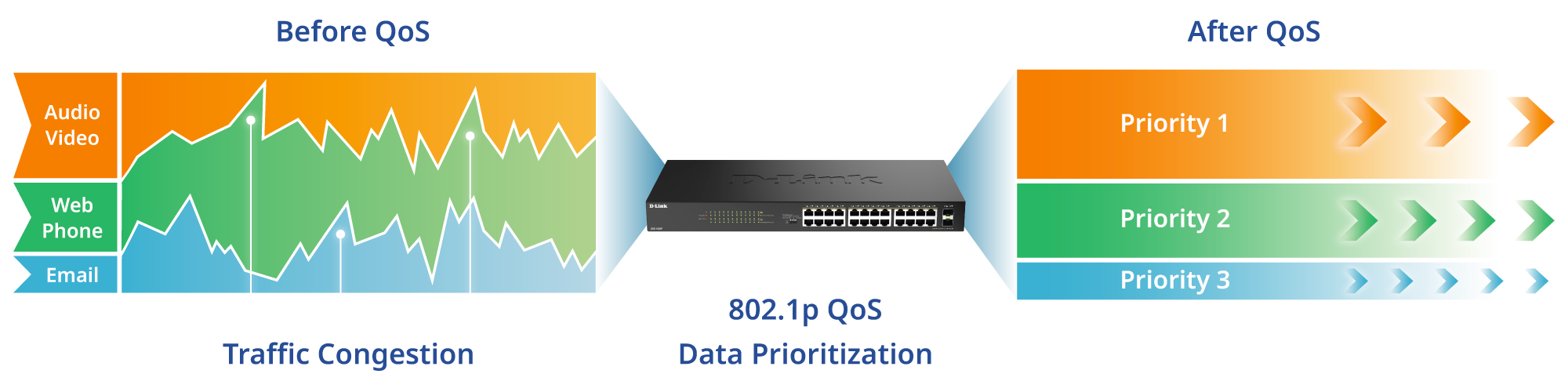 The D-Link DGS-1026P 24-Port Unmanaged PoE+ Switch with 2 SFP Ports includes Quality of Service (802.1p QoS) support to help manage and prioritize network traffic. This allows voice calls, video streams, and other time-sensitive data to move more efficiently through the network, which can improve overall responsiveness. The switch also follows the US NDAA and TAA standards, which could be important for organizations that need trusted hardware (Contact us to learn more). Together, these features support reliable performance while helping meet regulatory and procurement guidelines.
