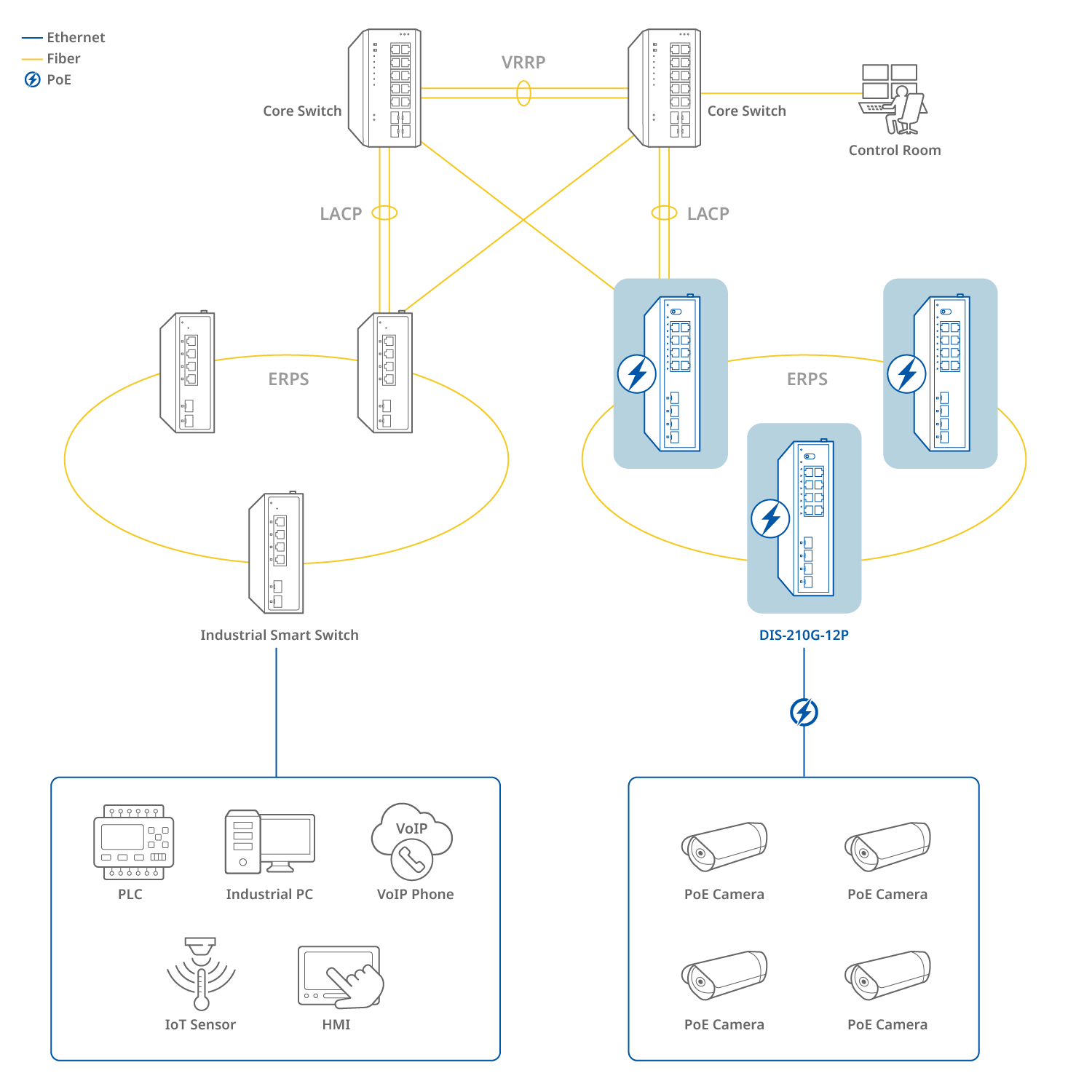The DIS-210G-12P is an industrial smart switch equipped with eight 1G ports and four 1G SFP ports for network management and aggregation. With a total power budget of up to 240W, each port can supply up to 30W. The SFP ports support long-distance data transmission, rapid failover redundancy, and throughput aggregation. The DIS-210G-12P supports ERPS and static routing, which reduces latency, enables effective traffic control, and improves network scalability and efficiency.