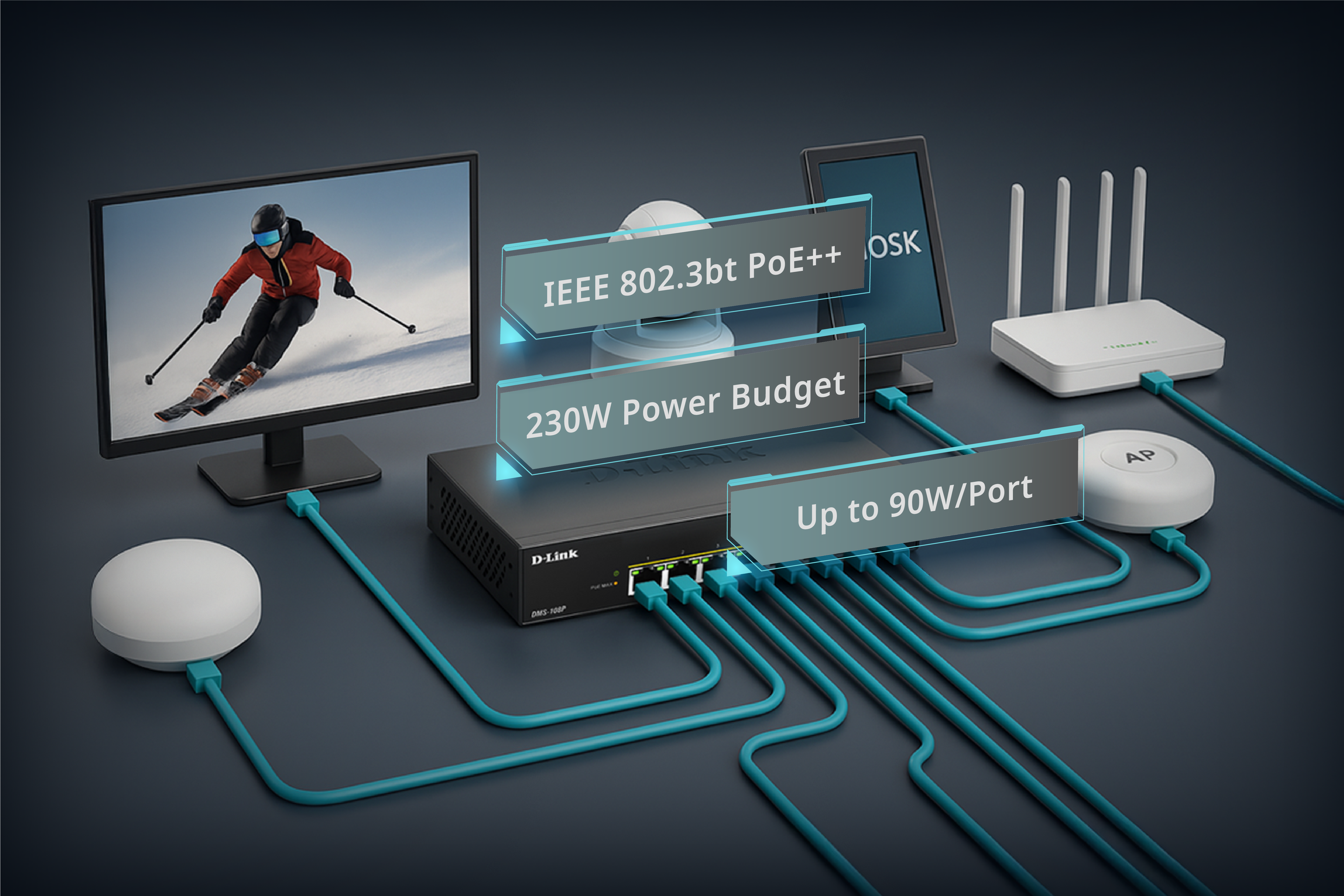 The DMS-108P with IEEE 802.3bt (PoE++) delivers up to 90W per port with a 230W total power budget, enabling high-performance devices without additional power supplies. Ideal for Wi-Fi 6 access points, PTZ cameras, kiosks, smart LED lighting systems, and much more. PoE++ simplifies installation, reduces cabling costs, and enhances energy efficiency.