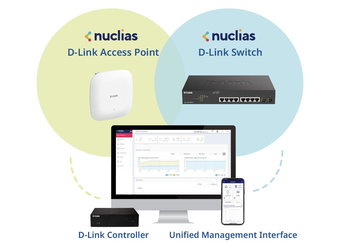With the DNH Nuclias Network Controller series, you can easily centralize the management of D-Link's AP and switches , offering more convenient and graphical interface-based centralized monitoring.