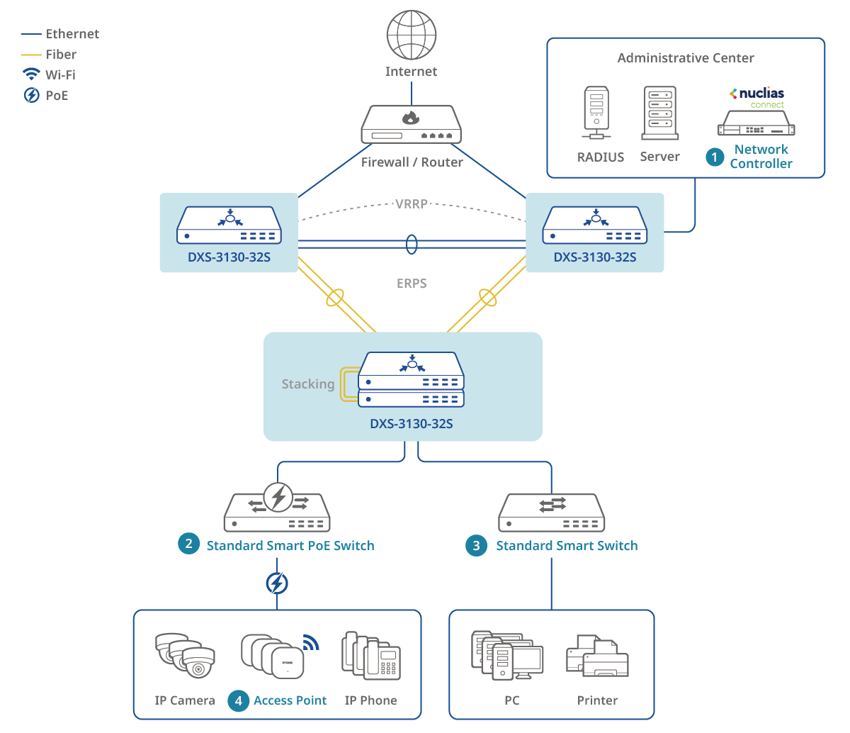 The DXS-3130-32S ensures continuous uptime with redundant power and stacking. It's 50ms ERPS recovery minimizes downtime, loopback detection blocks storm-affected ports, and VRRP provides seamless backup routing making it ideal for hospitals, factories, and other mission-critical networks.