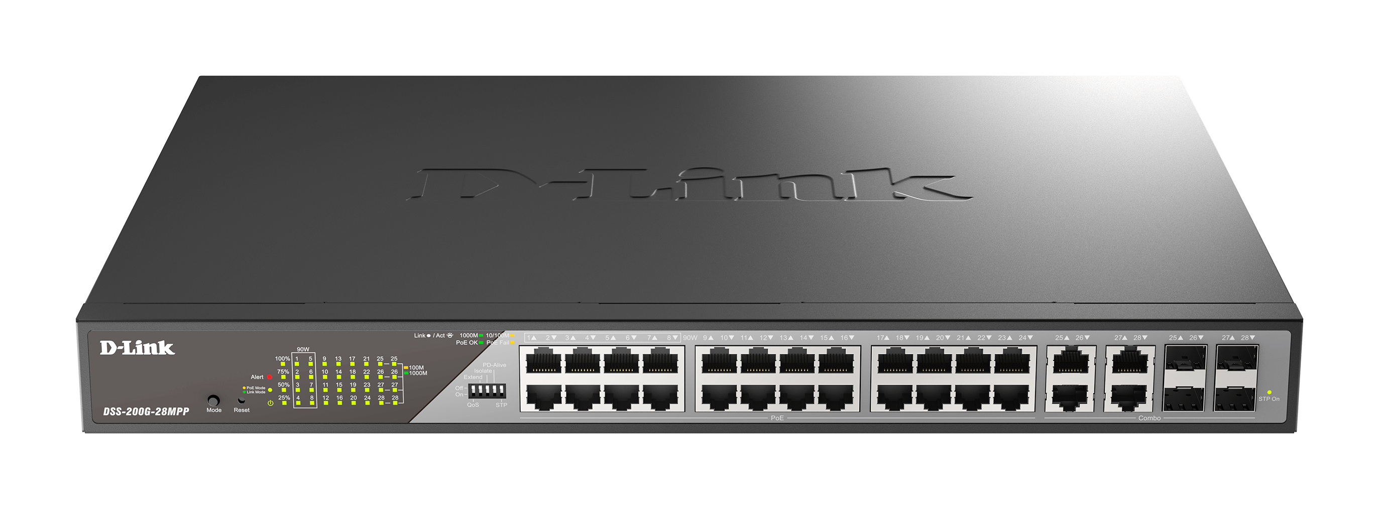 See your remaining power availability with the built-in PoE Power Budget LEDs for 25%, 50%, 75%, and 100% power usage at a glance. And utilise up to 518W, with 90W on 8 ports and 30W on 15 ports for DSS-200G-28MPP, so you can rapidly deploy more devices.